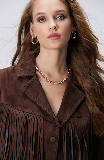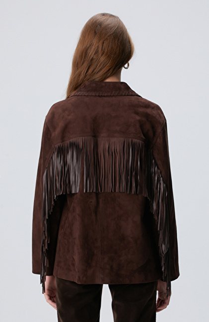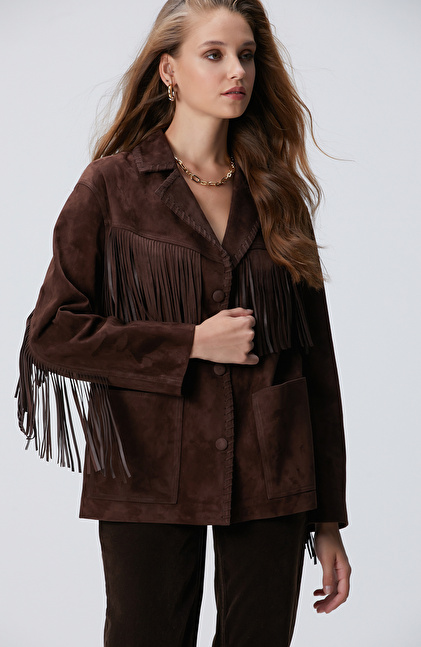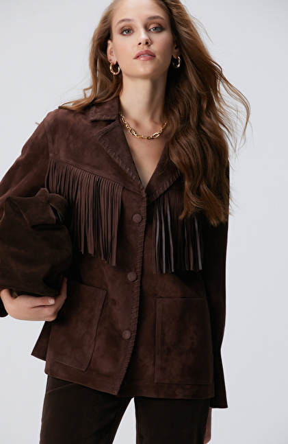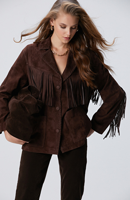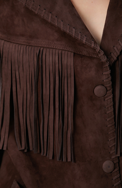 Acı Kahve Püskül Detaylı Süet Deri Mont