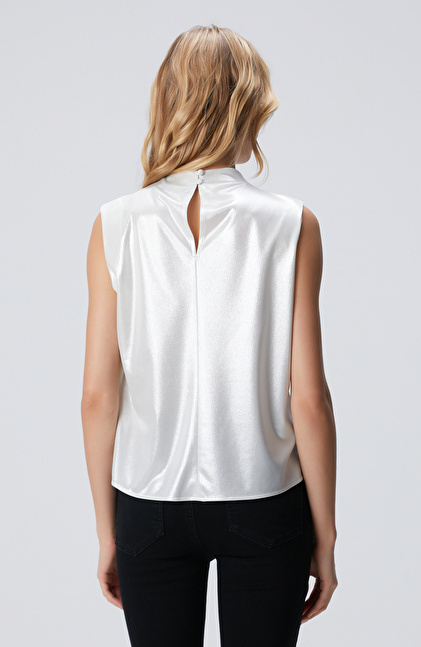 Açık Bej Dik Yaka Kolsuz Drape Detaylı Bluz