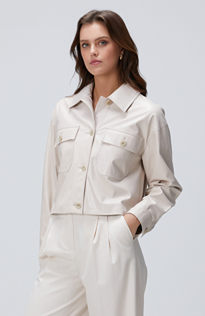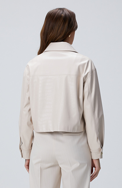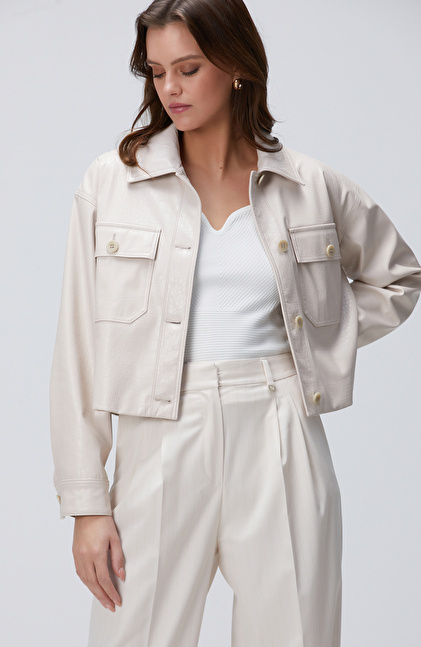Regular Fit; Gömlek Yaka; Uzun Kol; Vegan Deri Mont; Kapaklı Cepli
