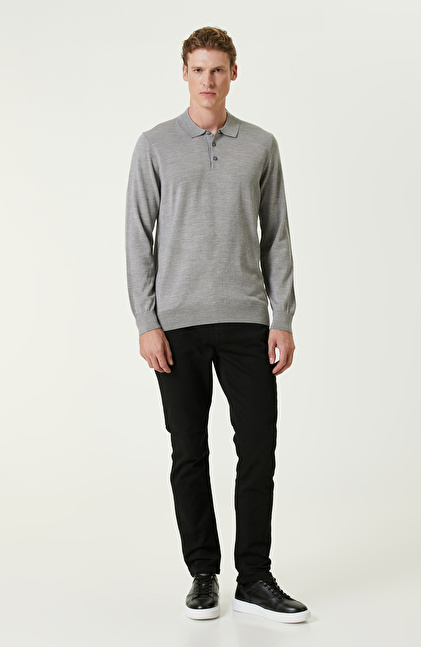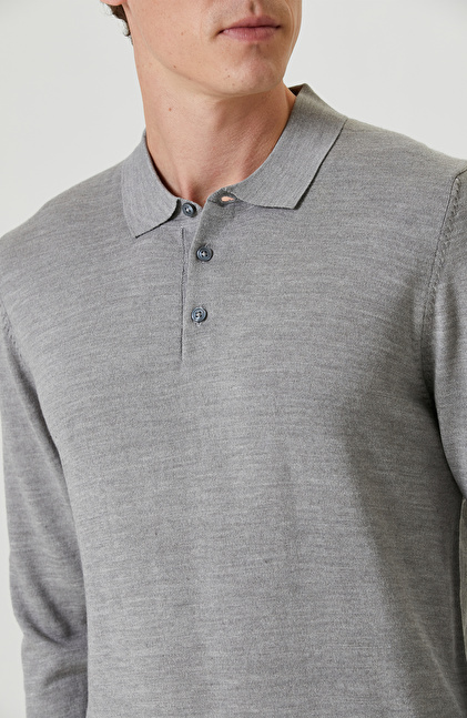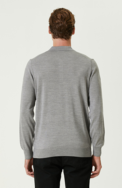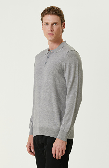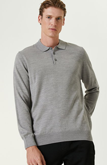 Açık Gri Polo Yaka Yün Karışımlı Triko Kazak