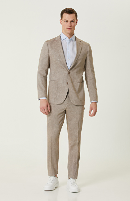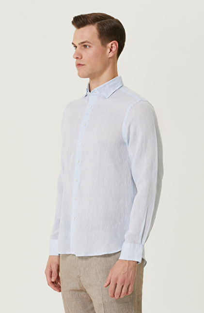 Comfort Fit; Alttan Britli Yaka; Uzun Kollu; Dokuma Keten Gömlek
