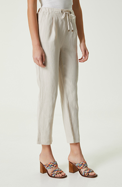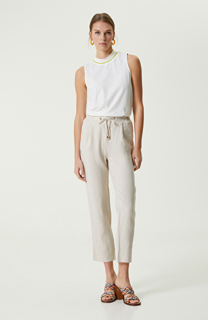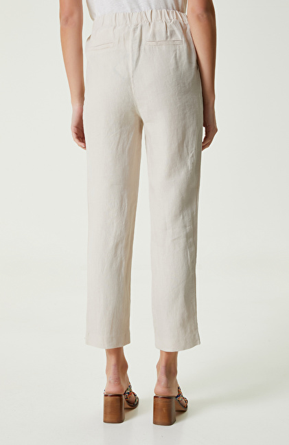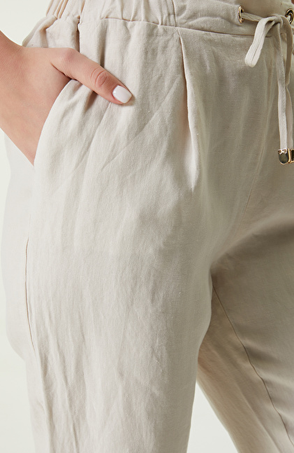 NetWork’ün Smart Casual koleksiyonunda yer alan Bej Beli Büzgülü Keten Pantolon, şık giyinmeye özen gösteren stil sahibi kadınlar için eşsiz bir alternatif sunar. NetWork’ün yalın ve zarif çizgilerini vurgulayan beli büzgülü keten pantolon, kadın yaz gardırobu için zamansız bir tercihtir. Yüksek bel ve düz paça ayrıntıları ile detaylandırılan şık pantolon, tamamen keten kumaştan elde edilir. Regular fit kalıbıya vücudun gün boyu rahat etmesini sağlar. Dokuma bej pantolonu, sıcak yaz günlerinde kırık beyaz tişört, hasır çanta, önü açık kahverengi bir topuklu ayakkabı ile kombinleyebilir, dilerseniz kahve tonlarda bilezik ve küpeler ile kusursuz uyumu yakalayabilirsiniz.
