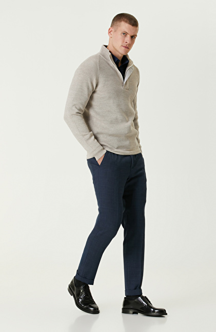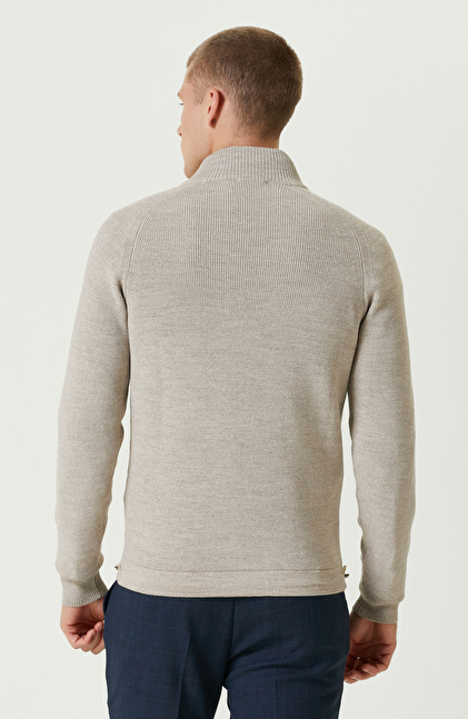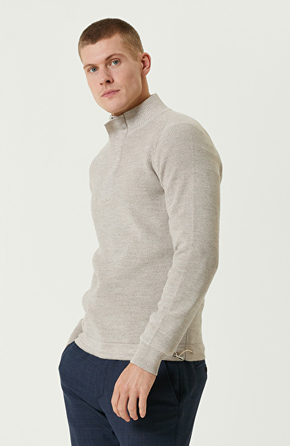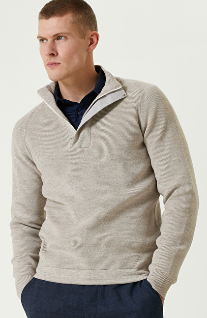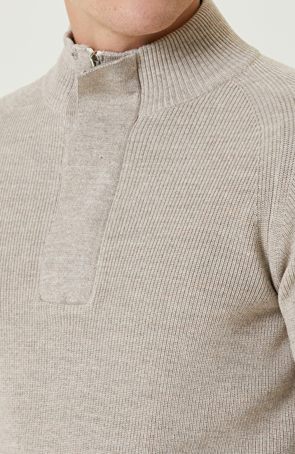 Bej Dik Yaka Fermuarlı Triko Kazak