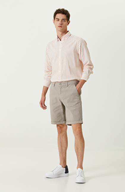 Zamansız tasarımlara kusursuz ve yenilikçi dokunuşlar katan NetWork, Bej Diyagonal Duble Paça Şort ile stil zevki yüksek erkeklerin yaz gardırobunu zenginleştirir. Pamuklu dokuma şort, esnek kumaşıyla casual kombinler için çok uygundur. Duble paça ve yan cepli tasarım, seyahat destinasyonlarından günlük aktivitelere kadar tüm günlük planlarda mükemmel görünür. Bağcıklı orta bel olarak tasarlanan şort, ilkbahar ve yaz aylarında tekrar tekrar giyebileceğiniz şıklık sunar. Diyagonal desenler ise tasarıma modern ve hareketli bir tarz katar. Bej şortu; açık renklerde çizgili keten gömlek ve deri sneaker ile çağdaş ve cesur bir çizgide kombinleyebilirsiniz.