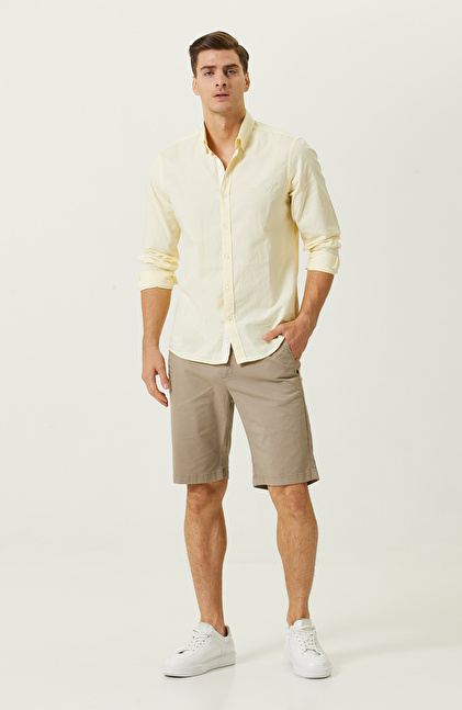Zamansız detaylarıyla öne çıkan NetWork Casual çizgisinde yer alan Bej Duble Paça Slim Fit Şort, metropolde yaşayan modern erkeklerin stilini konfor elementleriyle buluşturur. Beach Wear stilindeki model, ilkbahar dönemlerinde kombinlerinize dinamik dokunuşlarda bulunmanıza yardımcı olur. Normal belli tasarımı, yüksek kaliteli kumaşı ve duble paça detaylarıyla hem konforlu hem de şık bir parçadır. Rengiyle sosyal açıdan aktif erkeklerin kombinlerinde kolaylıkla değerlendirebileceği bir yapıya sahiptir. Şortu krem ya da beyaz gibi açık tonlarda comfort fit gömleklerle kombinleyerek şehirli stilinizi yansıtabilir, beyaz spor ayakkabılarla eşsiz bir uyum yakalayabilirsiniz.