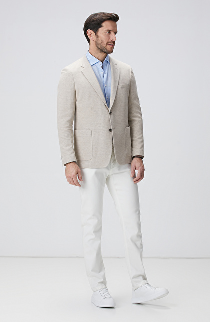 Slim Fit; Mono Yaka; Uzun Kol; Dokuma; Keten Karışımlı Örme Ceket; Armürlü; Aplike Cepli