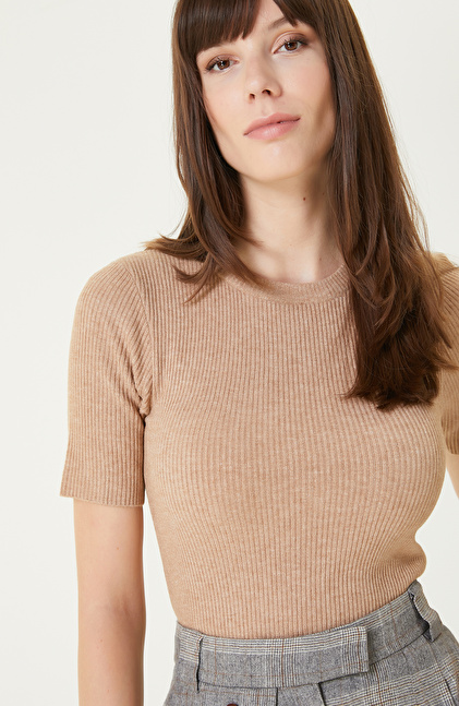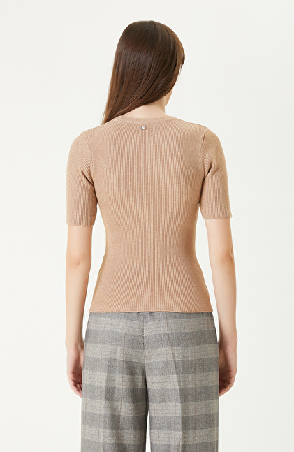 Bej Melanj Kısa Kol Basıc Triko Kazak
