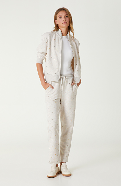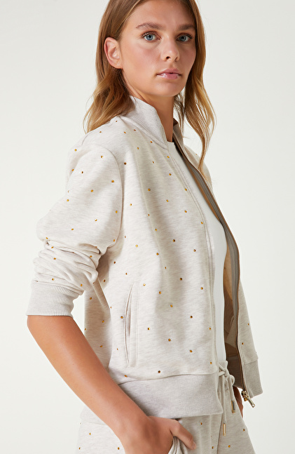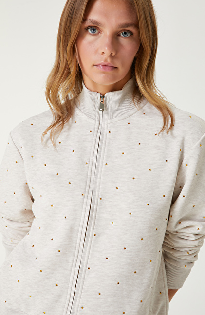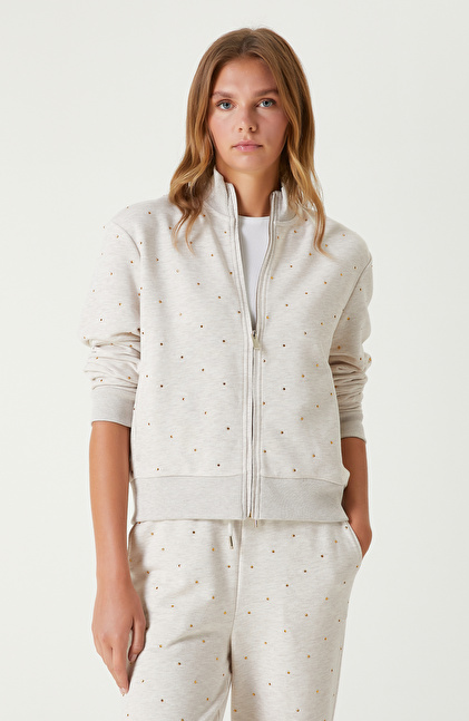 Bej Melanj Taş Baskı Detaylı Sweatshirt