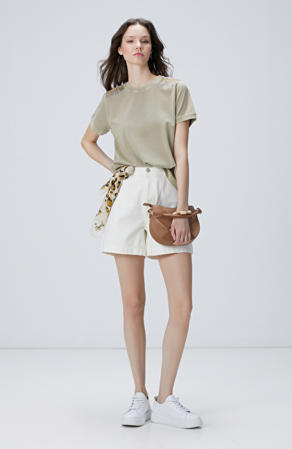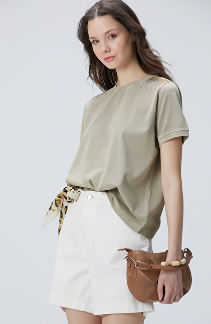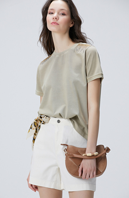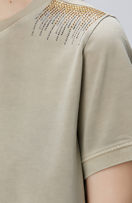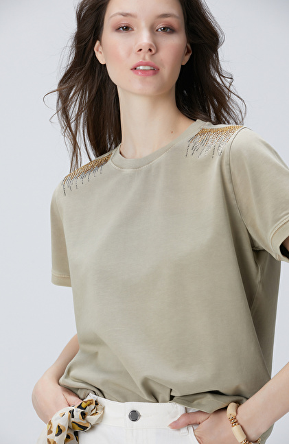 Bej Omuz Taş Detaylı T-shirt
