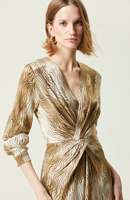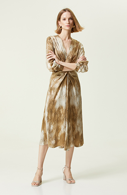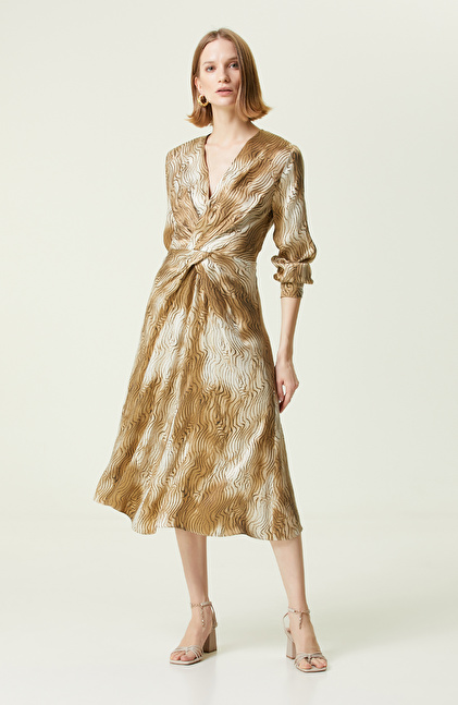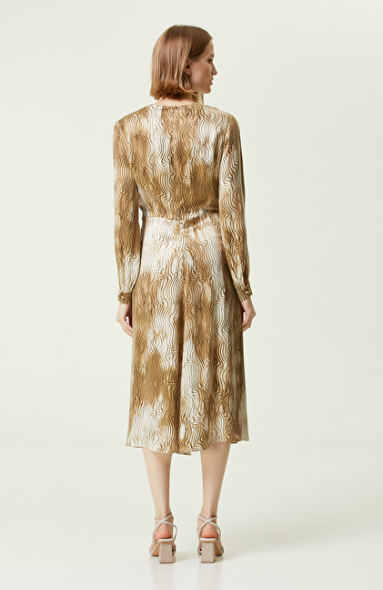 NetWork’ün modern tasarımları arasında yer alan Bej V Yaka Uzun Elbise, şık giyinmeye özen gösteren kadınların seçimidir. Yaz sezonunda kullanılmak üzere tasarlanan yüksek kaliteli elbise, Down to Earth serisinin smart casual tarzını vurgular. Uzun boya sahip desenli bej elbise, regular fit yapısı ile içerisinde konforlu hissettirir. Kupro karışımlı dokuma kumaşlı parçanın yapısı yumuşacıktır ve ilkbahar günlerinde giymek üzere sosyal hayatta aktif NetWork kadını için ideal tercihler arasındadır. V yaka ve uzun kol detaylı elbiseyi; altın rengi halka küpeler, açık renk tonlarında ince topuklu ayakkabı ve minimal bir çanta ile kombinleyerek iddialı stilinizi sergileyebilirsiniz.