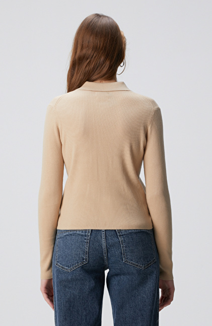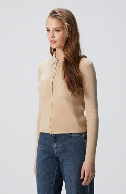 Bej Yün Karışımlı Fermuarlı Triko Kazak