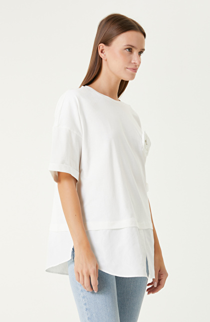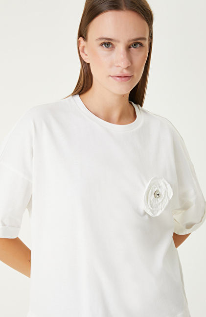 Beyaz Çiçek Aplike Detaylı Tshirt