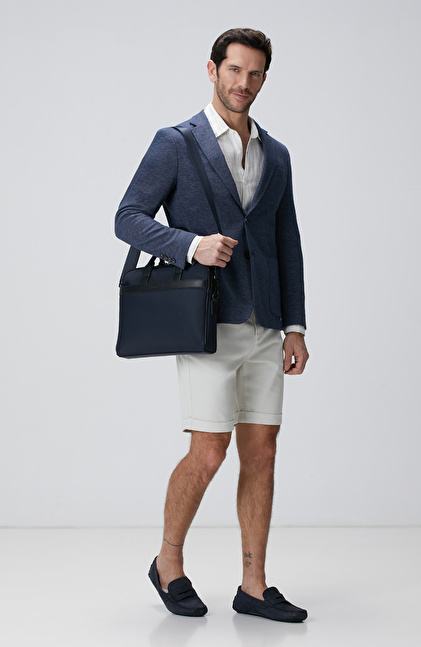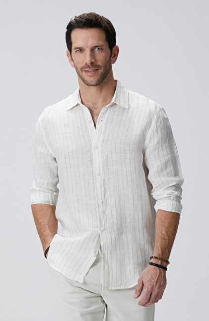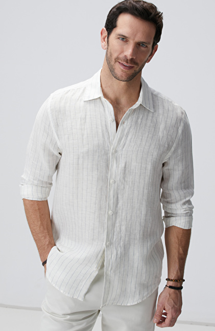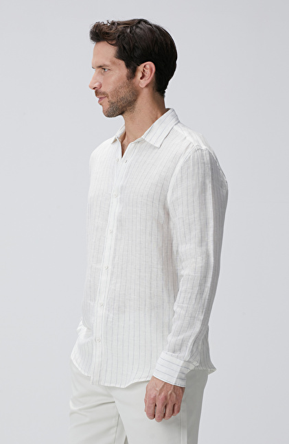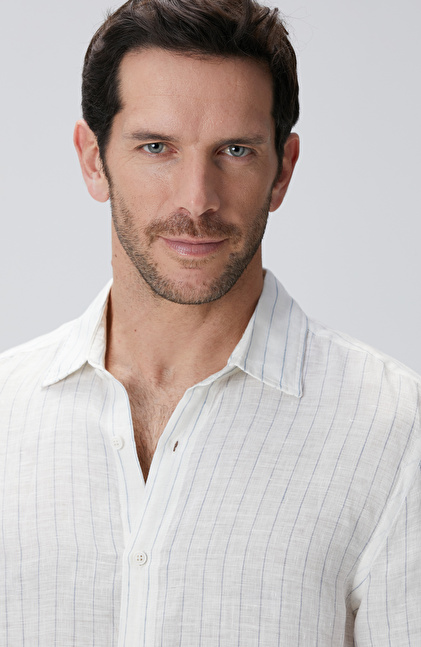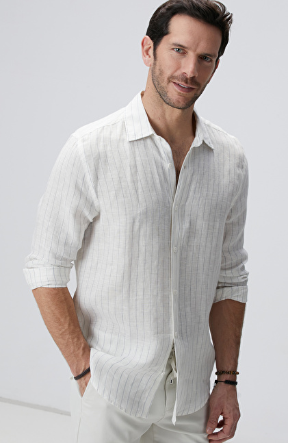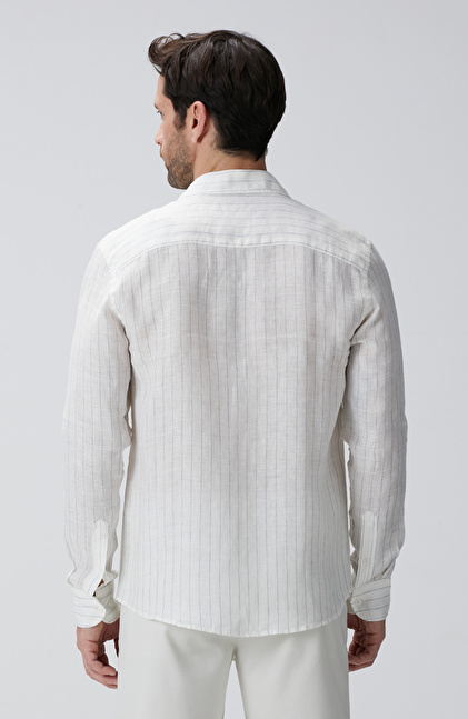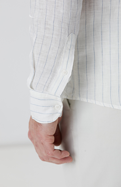 Beyaz Çizgi Desenli Keten Gömlek