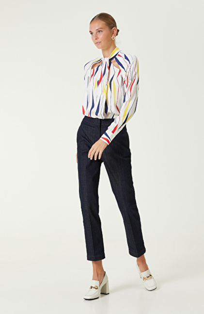 Beyaz Desenli Bluz, iddialı ve özgün tasarımıyla özgüveni yüksek şehirli kadınlara hitap eder. NetWork Smart Casual koleksiyonunun dikkat çeken parçalarından biridir. Canlı ve kontrast renklere sahip geometrik deseniyle modern ve enerjik bir şıklık sunar. Diyagonal dekoltesi ve dik yaka formu, Network’ün benzersiz moda anlayışının çizgisini taşır. Rahatlık sağlayan üst kalite kumaş içeriği ve regular fit kesimiyle konforlu hissettiren uzun kollu bluzu, sonbahar kış kombinlerinizde tercih edebilirsiniz. İlham veren ve cesur tarzınızı yansıtmak için koyu renkli yüksek bel kumaş pantolon, blazer ceket ve kalın topuklu stiletto seçebilir, kombininizi gold renkli küpeyle tamamlayarak zengin bir dokunuş yapabilirsiniz.