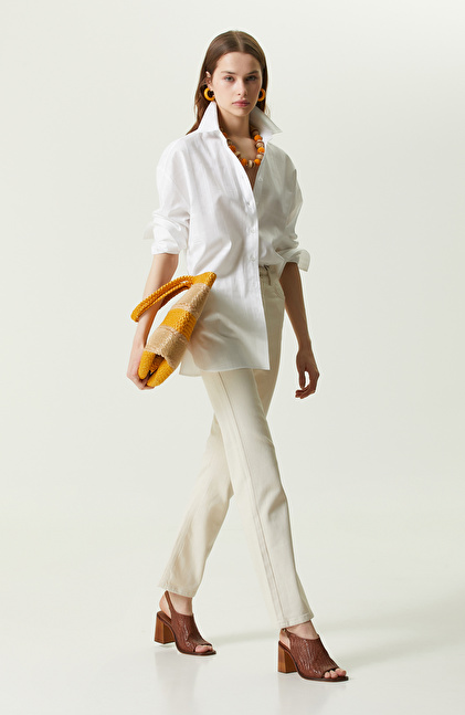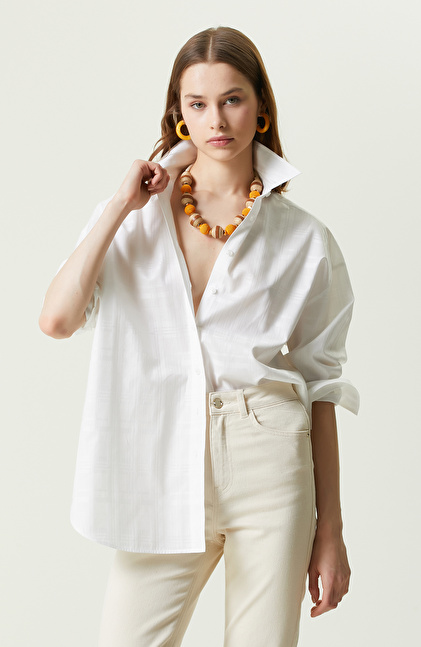 NetWork’ün yenilikçi tasarımları arasında bulunan Beyaz Ekose Gömlek, şık giyinmeye özen gösteren kadınların ilkbahar/yaz sezonu kullanımına uygundur. Regular fit kalıplı parçanın vücut üzerinde yüksek ve iddialı bir duruşu vardır. Uzun kol ve gömlek yaka detaylarına sahip model, smart casual stilini vurgular. Üst kalite kumaşlardan elde edilen gömlek, dokuma hissiyatına sahiptir ve sıcak günlerde yarattığı ferahlık hissi sayesinde konfor düzeyini artırır. Stil sahibi ve entelektüel kadınlara hitap eden ekoseli parça, düğme kapamalı olarak tasarlanır. Oversize form uzun kol gömleği ilham verici şekilde kombinlemek için; ekru pantolon, hardal büyük kol çantası, toprak tonlarında sandalet ve renkli halka küpeler kullanabilirsiniz.