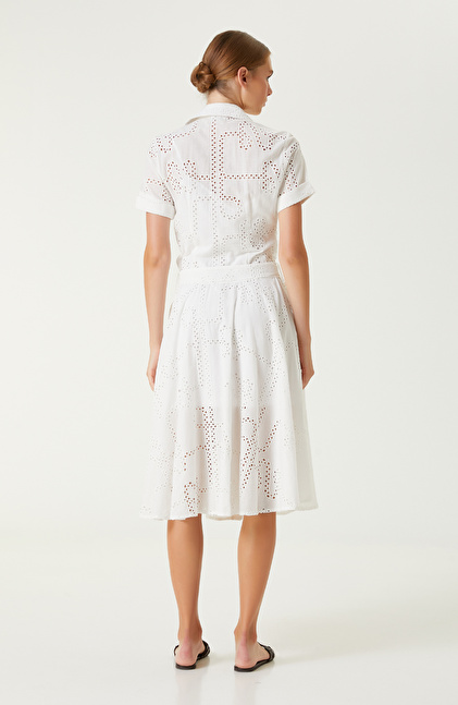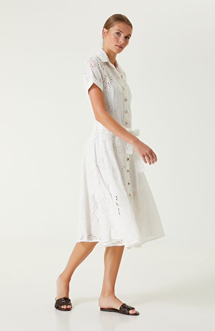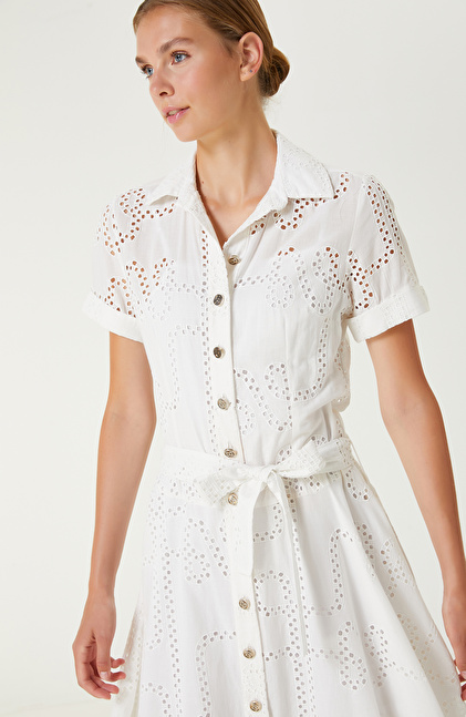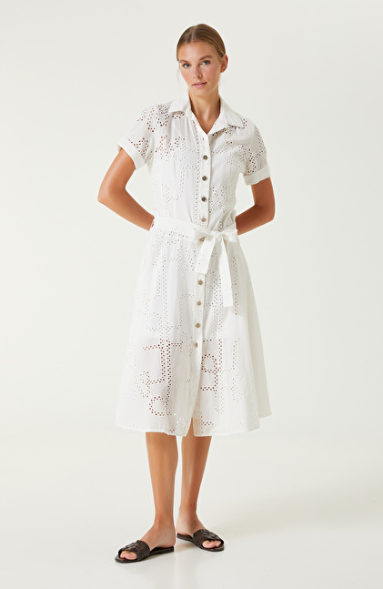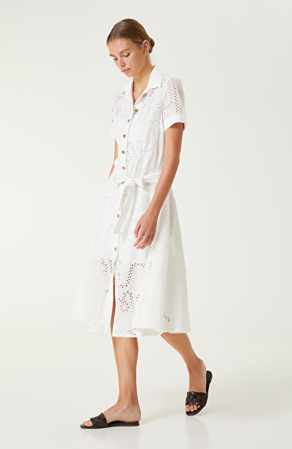 Gömlek Yaka; Düğme Kapatmalı; Midi Güpür Elbise; Beli Kuşaklı;