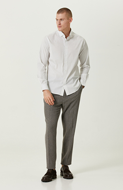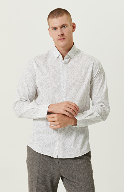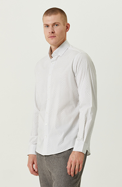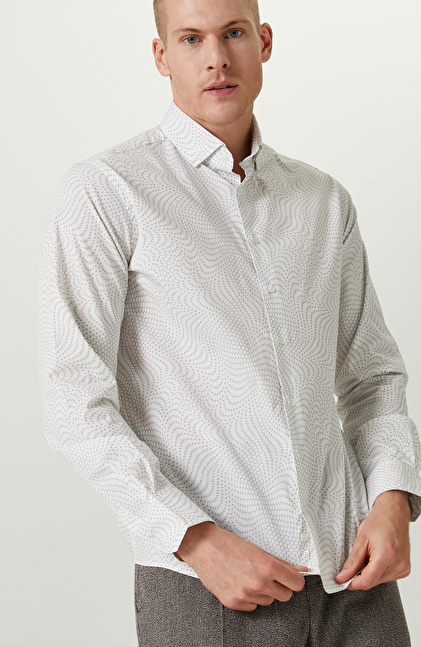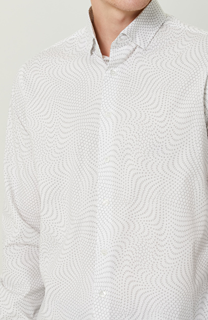 Comfort Fit; Alttan Britli Yaka; Uzun Kol; Dokuma Gömlek; Baskılı; Cepsiz