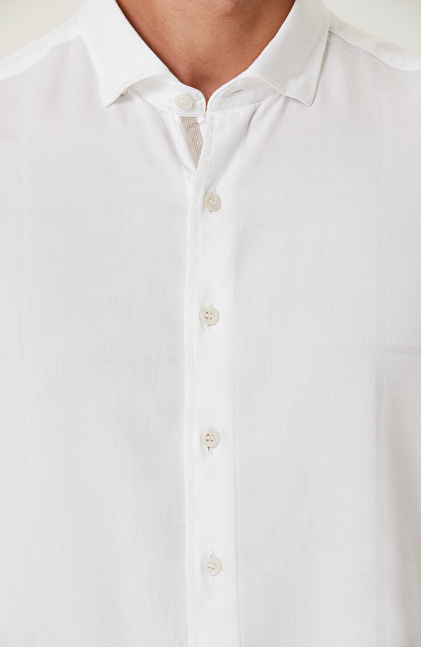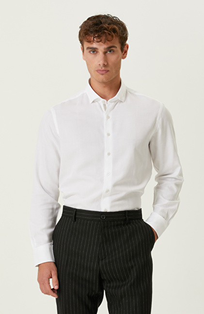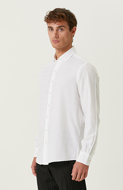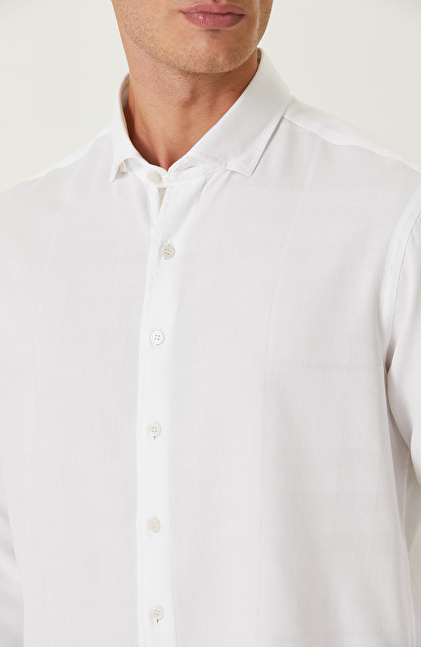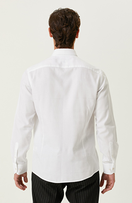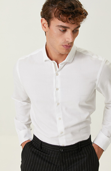Casual, klasik ve hemen her kombin için ilham veren Beyaz Jakarlı Gömlek, metropol erkeklerinin gardırobunu çok yönlü hale getirir. Takım elbise, chino veya jean pantolon kombinlerine uyarlanabilen gömlek, her tarza uyum sağlar. Alttan britli yaka yenilikçi formu sayesinde kravatlarınızın uzun süre sabit kalmasına yardımcı olur. Jakar desenli kumaş, sade ve lüks görünüm tercih eden erkekler için idealdir. Cepsiz tasarımı ise ceketlerinizin daha fit durmasına yardımcı olur. Rahat stilinizi destekleyen comfort fit kalıp gömlek, fit veya rahat kalıba sahip pantolonlarla eşleştirilebilir. Beyaz gömleği; antrasit yün pantolon, siyah ceket, gri kravat ve siyah süet loafer modelleriyle kış stiline uygun şekillerde kombinleyebilirsiniz.