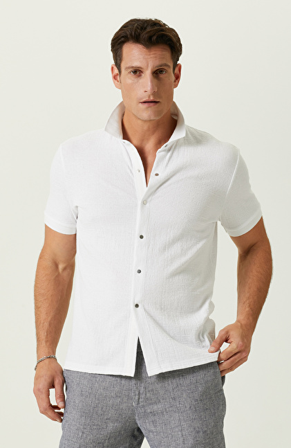 Şehirli ve sosyal açıdan aktif erkeklerin şık görünümünü yansıtan Beyaz Jakarlı Polo Yaka Fit Gömlek, şehirli yapısıyla öne çıkar. NetWork Casual çizgisindeki ürün, yüksek kaliteli kumaşıyla oldukça rahat bir yapıya sahiptir. Örme kumaşı ve kendine has yüksek duruşuyla her ortamda stilini yansıtmak isteyen erkekler için idealdir. Trendleri stiline uyarlamayı sevenler için lüks bir duruş sunar. Ayrıca Non Iron teknolojisi sayesinde ütü gerektirmez. Gömleği gri renkli comfort fit pantolon ve beyaz spor ayakkabılarla beraber kullanabilir, ince bir bileklikle son dokunuşları yapabilir ve şehirli görünümünüzü her ortamda yansıtmaya başlayabilirsiniz.