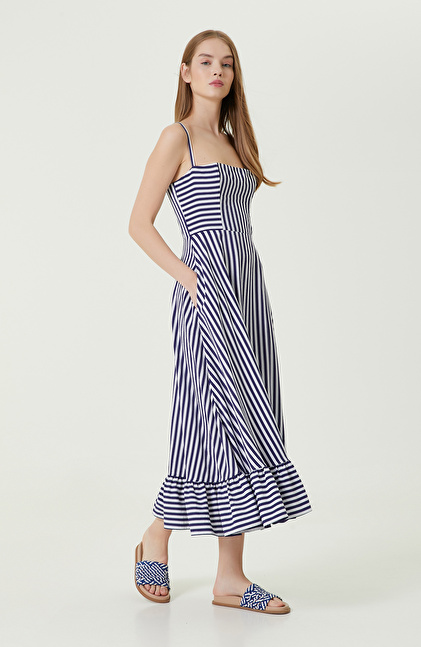 NetWork’ün yenilikçi modasına göz kırpan Beyaz-Lacivert Çizgili elbise, stil sahibi kadınların tercih ettiği tasarımlardan biri olarak ilkbahar/yaz koleksiyonunda yer alır. Modası asla eskimeyen çizgili elbise, zamansız ve cesur parçalardan biridir ve vintage esintiler taşır. Regular fit yapısı ve dokuma kumaşı sıcak yaz günlerinde üstün rahatlık sağlarken, straplez ve askılı kol detayı kombininizle daima şık ve göz alıcı görünmenizi sağlar. Çizgili beyaz-lacivert tasarımı beyaz topuklu deri bir sandalet, lacivert omuz çantası, gümüş takılar ve tarzınızı yansıtacak güneş gözlüğüyle kombinleyebilir, stilinizle göz kamaştırabilirsiniz.