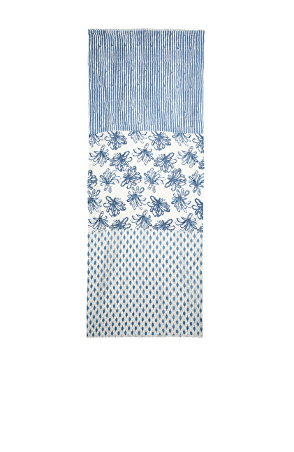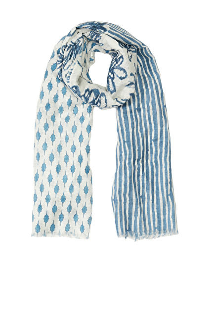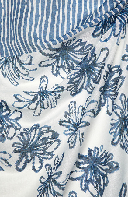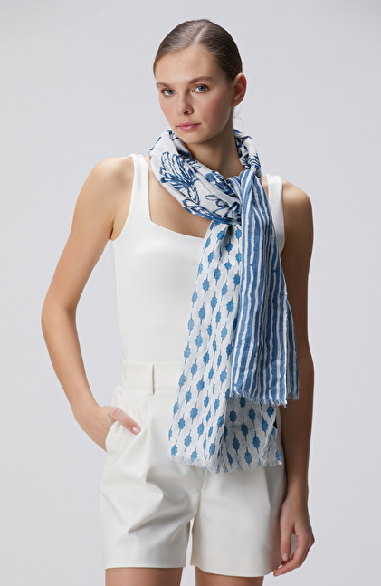 Beyaz Mavi Keten Karışımlı Kadın Şal