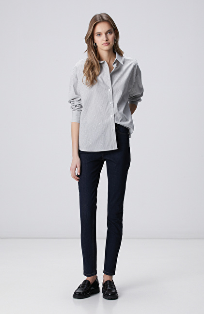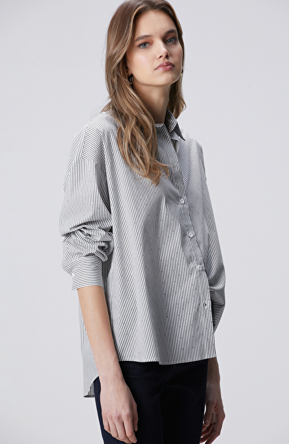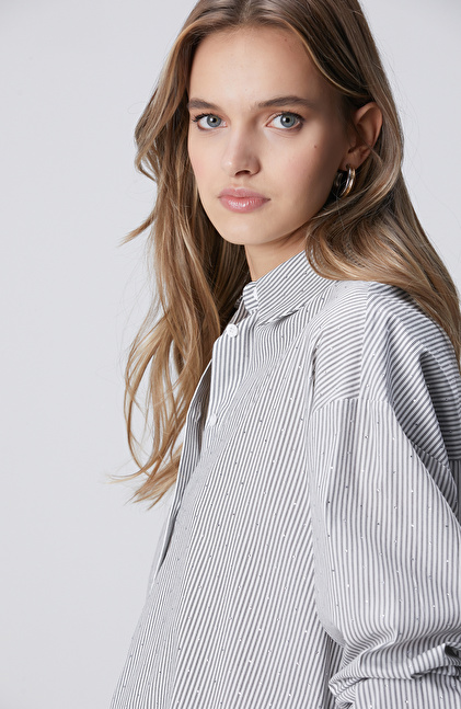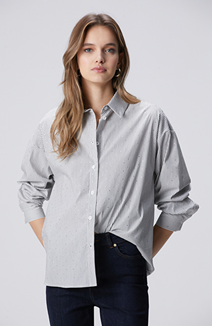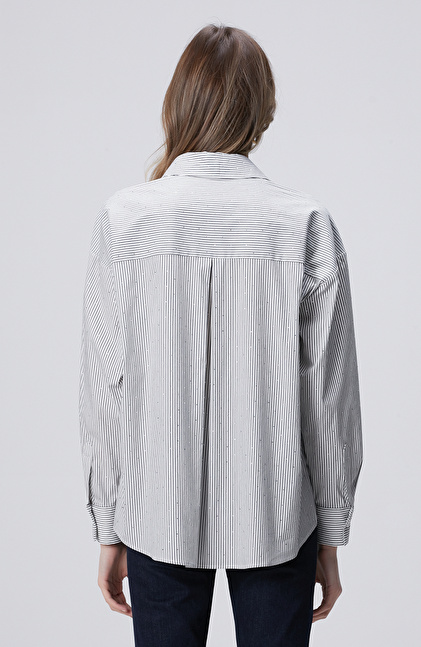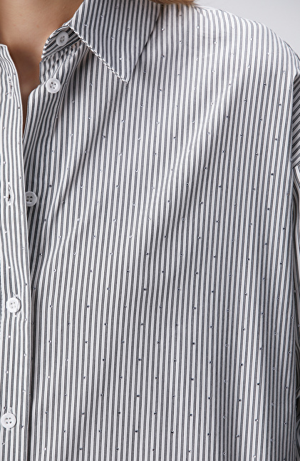 Beyaz Siyah Çizgili Taş Baskılı Gömlek