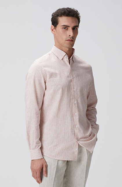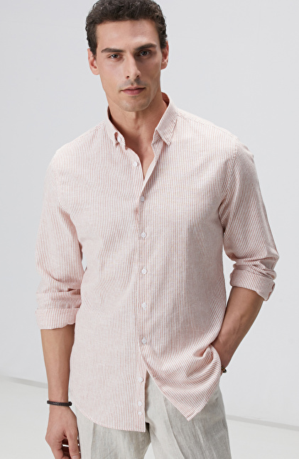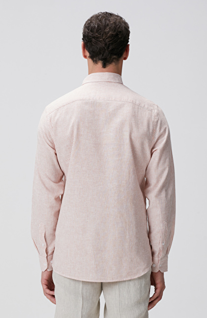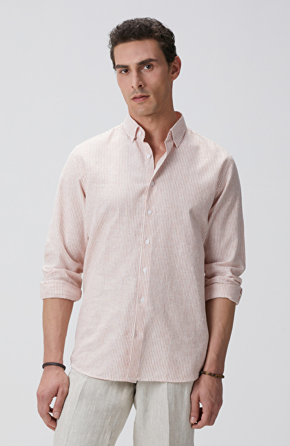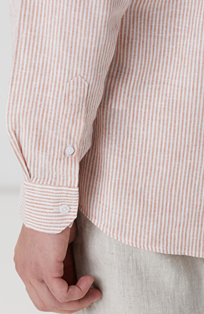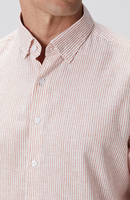 Beyaz Turuncu Çizgili Keten Karışımlı Gömlek