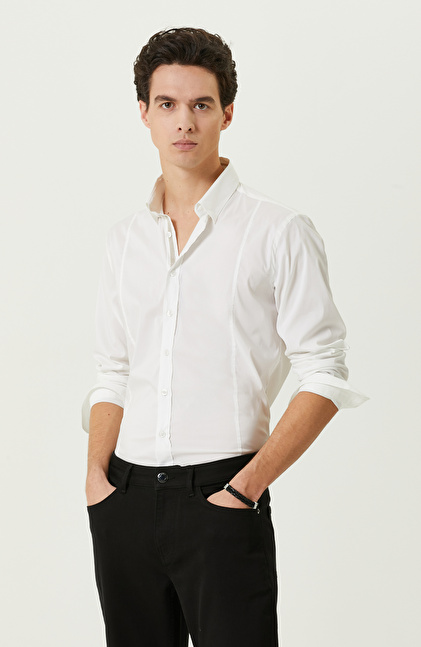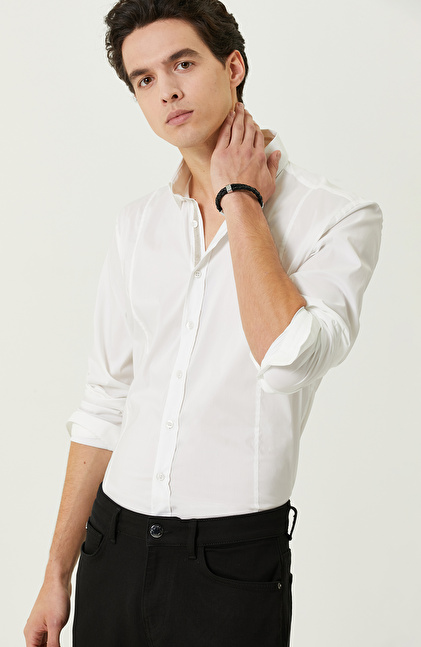 Şık detayların konforla buluştuğu beyaz uzun kollu cepsiz gömlek, Non Iron teknolojisi sayesinde sosyal açıdan aktif olan erkeklerin günlük hayatını kolaylaştırır. Ütüye ihtiyaç duymadığı için seyahat halindeyken bile şık giyinmeye özen gösteren erkeklere hitap eder. Yüksek kaliteli poplin kumaşı sayesinde ütüye ihtiyaç duymayan ürün, çağdaş çizgileri yüksek duruşuyla bir araya getirir. Gömleği kumaş pantolon ve ceketle kombinleyerek şehirli tarzınızı yansıtabilirsiniz. NetWork Smart Casual çizgisindeki ürün, hafifliği ve yüksek kaliteli kumaşıyla stilinizi dilediğiniz gibi tamamlamanızı sağlar. Koyu renkli ayakkabılarla kombinleyerek lüks bir görünüm yakalayabilirsiniz.