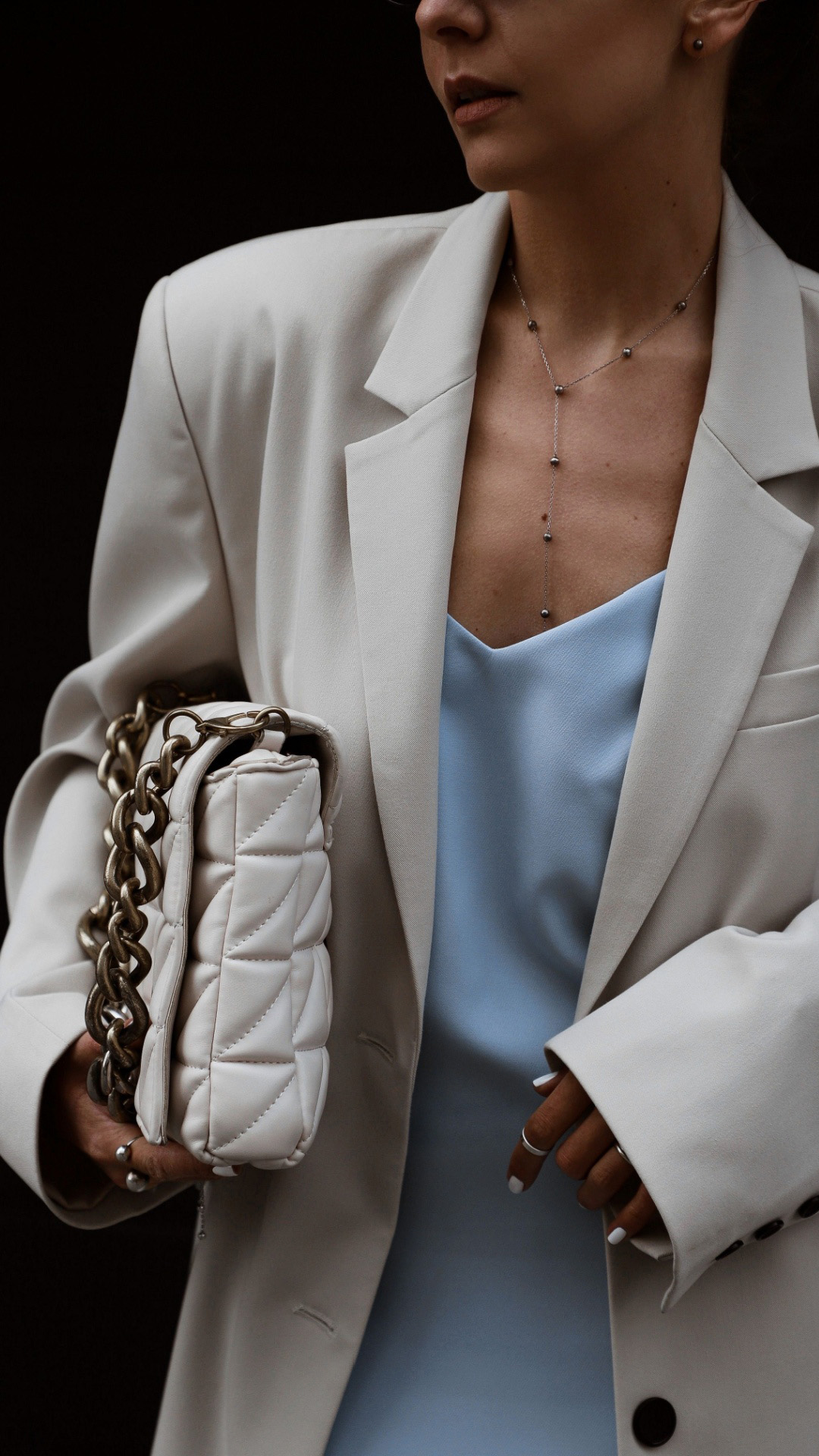 Beyaz blazer ceket ile zamansız zarafeti kolayca yakalayabilirsiniz. Birbirine uyumlu renklerdeki blazer ceket pantolon takım mevsimlik resmi kombinler için idealdir. Ceket altına şampanya gibi yumuşak nötr tonda ipek atlet giyerek sofistike görünümün anahtar olduğu iş toplantıları veya resmi etkinlikler için hazırlanabilirsiniz. Kombini inci küpeler, sivri burunlu ten rengi topuklu ayakkabı ve şık bir çanta ile kişiselleştirebilirsiniz.