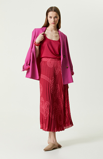 NetWork Pigment serisinin renkleriyle büyüleyici parçalarından biri olan Bordo Desenli Piliseli Etek, midi boyu ve piliseli tasarımı sayesinde ilkbahar/yaz sezonunda retro/modern stillere uyum sağlar. Her zaman genç ve dinamik hisseden zamansız kadınlar için ideal tasarıma sahip etek rengiyle casual kombinlere ilham verir. Pilise detayı destekleyen desen ise hareketli görünümler için idealdir. Midi boyu zarif görünümünüzü öne çıkarırken aynı zamanda çeşitli ayakkabı modellerini kullanmanızı sağlar. Desenli etek, normal bel yüksekliğine sahiptir, böylece gömlek, triko, bluzlarla rahatlıkla giyilebilir. Siz de midi boy eteği, ekru atlet, vizon mule ayakkabı ve fuşya el çantaları ile kombinleyebilirsiniz.