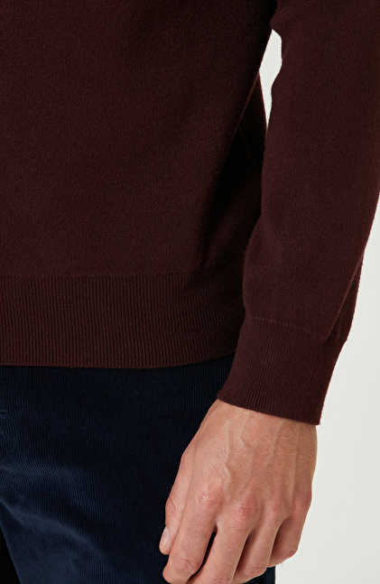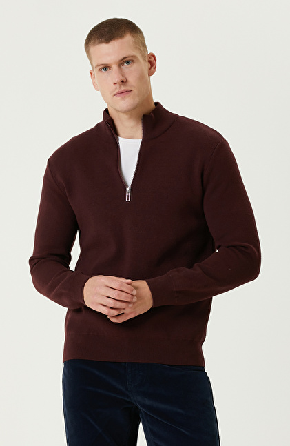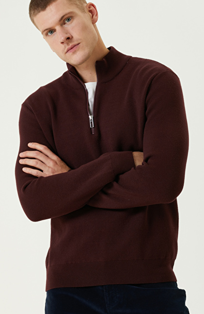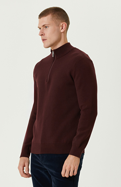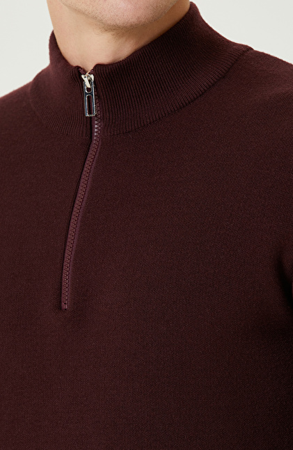 Bordo Dik Yaka Fermuarlı Triko Kazak