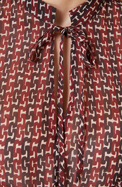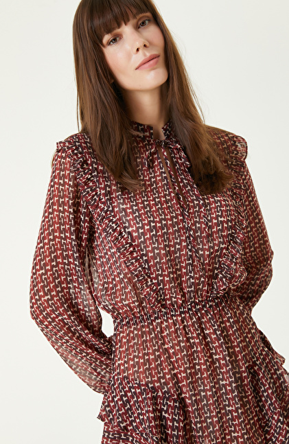 Bordo Kırık Beyaz Desenli Mini Elbise
