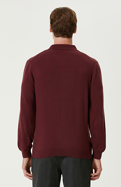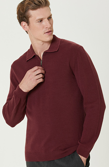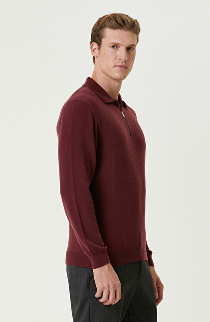 Bordo Polo Yaka Fermuarlı Triko Kazak