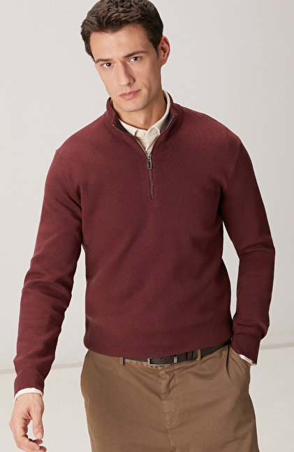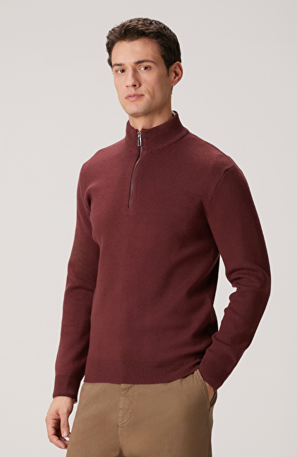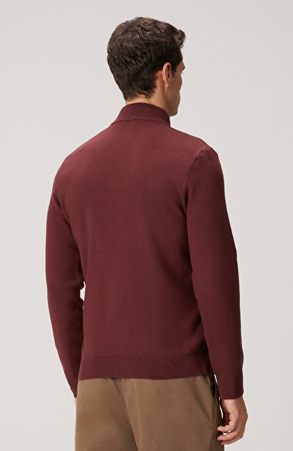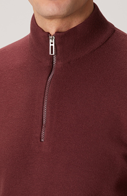 Bordo Yakası Fermuarlı Triko Kazak