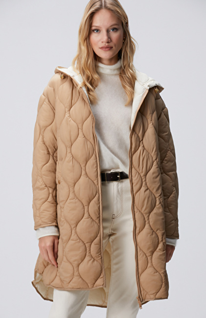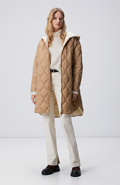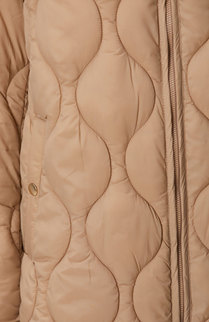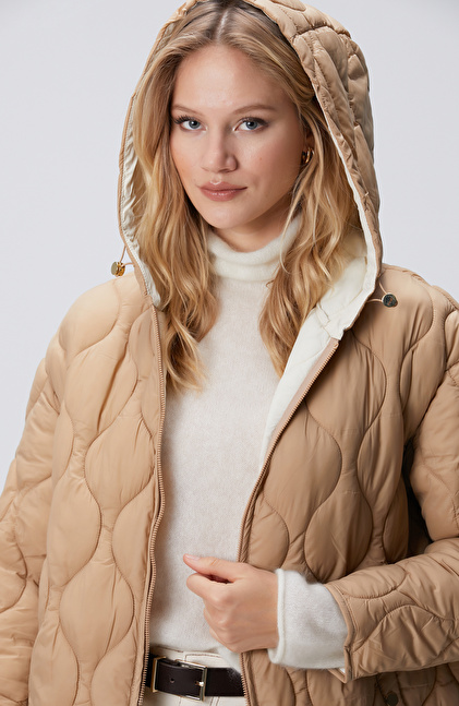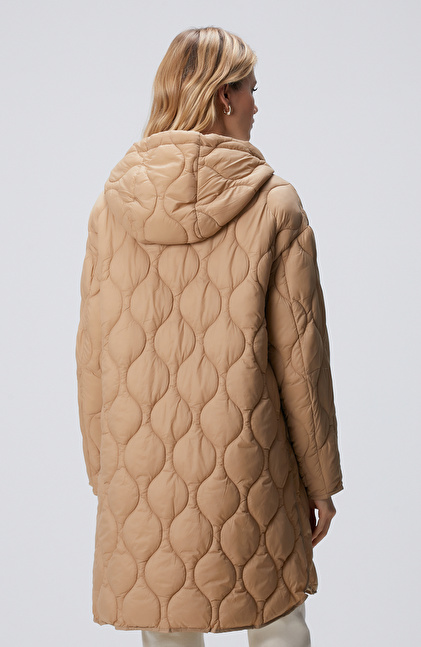 Camel Kapitone Desenli Kapüşonlu Kaban