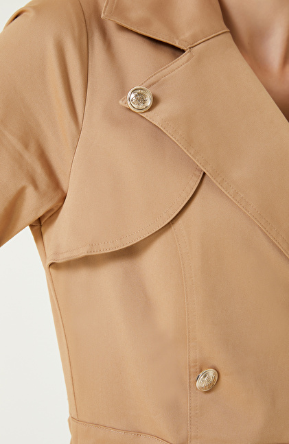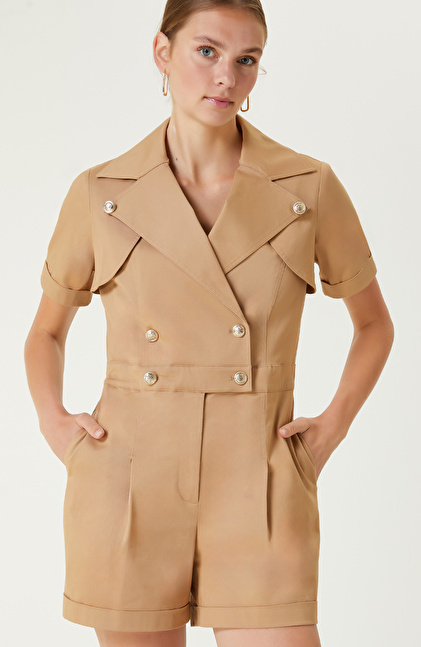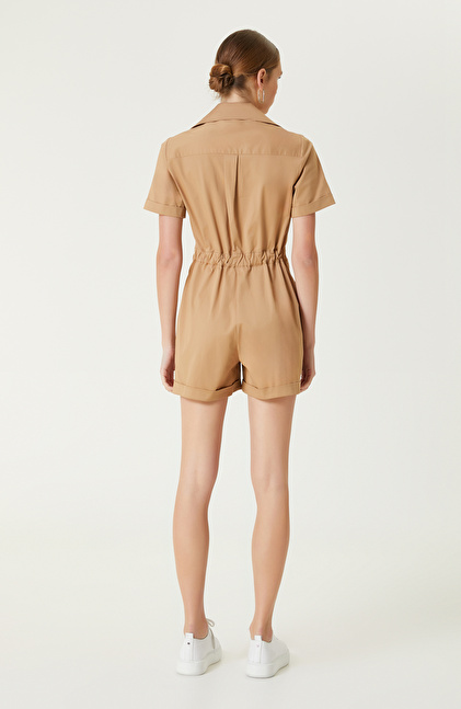 Regular Fit; Ceket Yaka; Düğme Detaylı; Beli Lastikli Tulum; Kısa Boy; Düz Paça; Kısa Kol; 2 Cepli