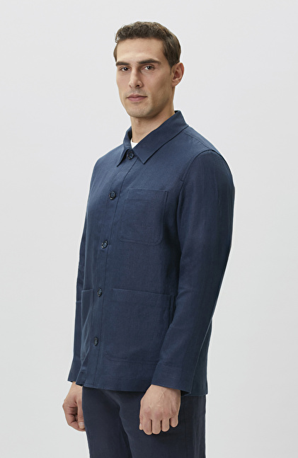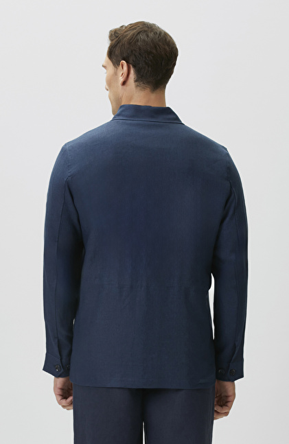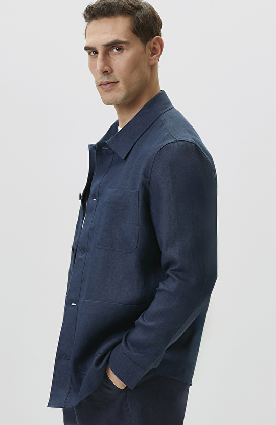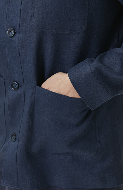 Comfort Fit Lacivert Cep Detaylı Keten Dış Gömlek