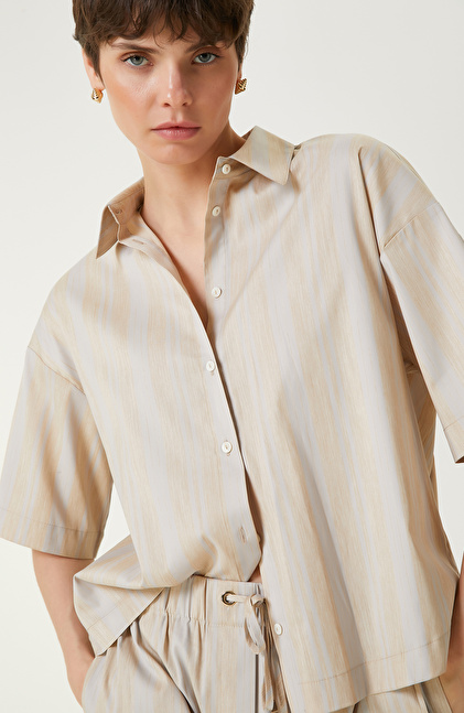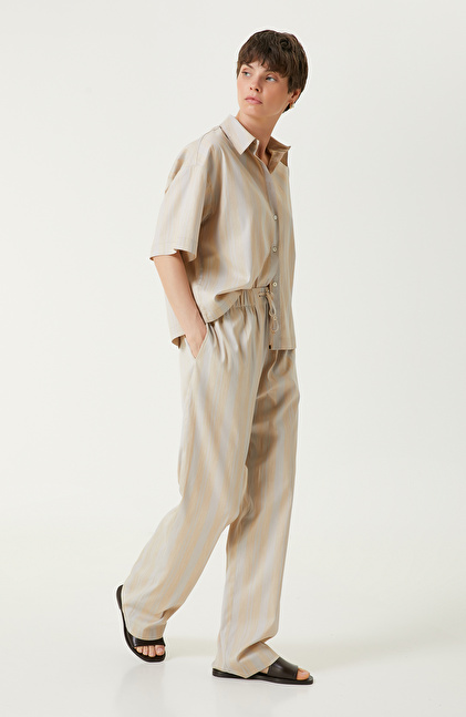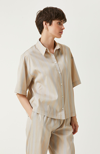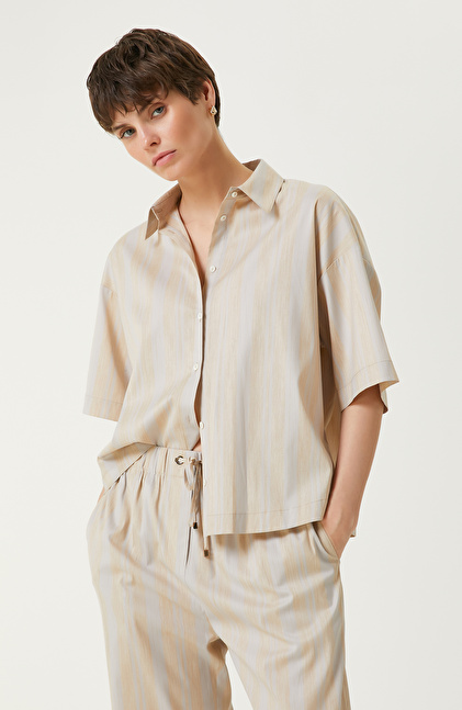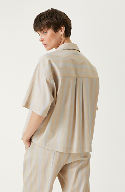 Ekru Bej Çizgili Gömlek