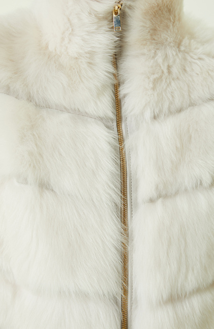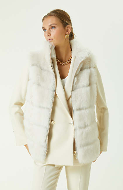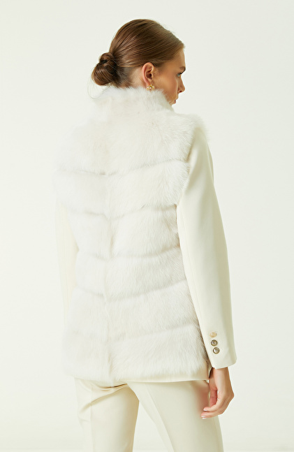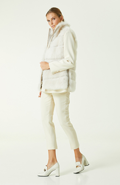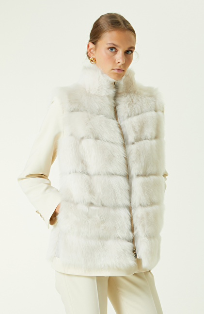 Ekru Çizgi Detaylı Deri Yelek