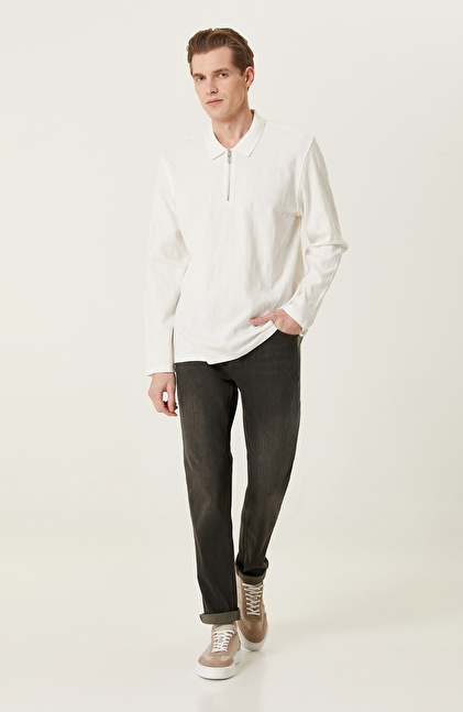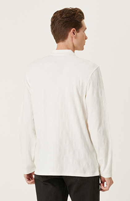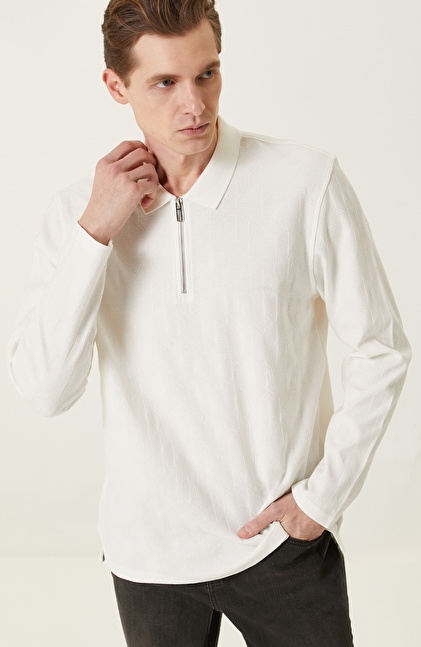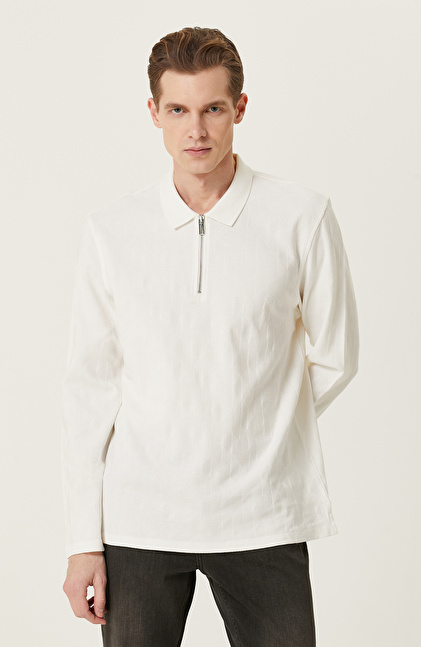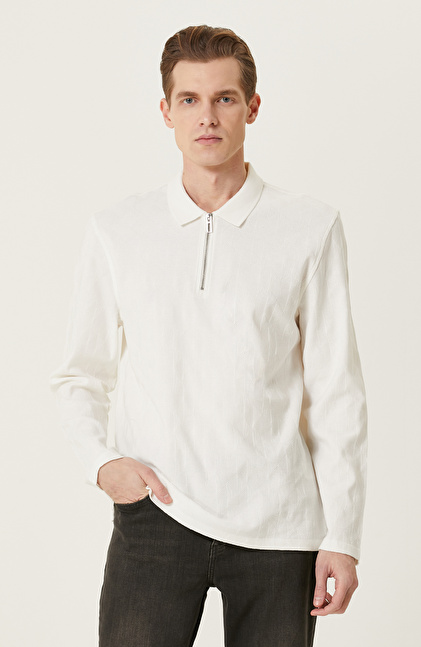 Ekru Fermuarlı Uzun Kollu Polo Yaka T-shirt