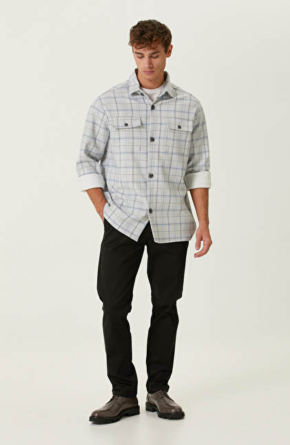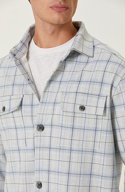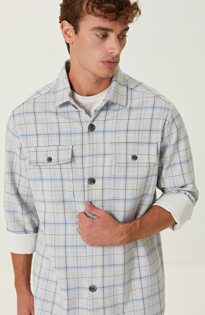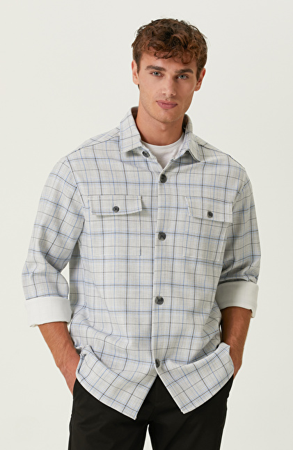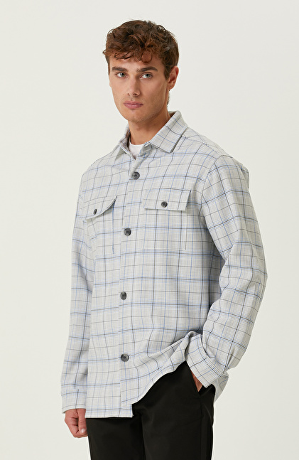 Ekru Mavi Ekose Cepli Dış Gömlek