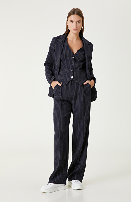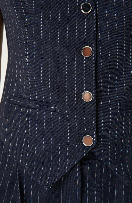 Navy Blue-Off White Wool Blend Striped Vest