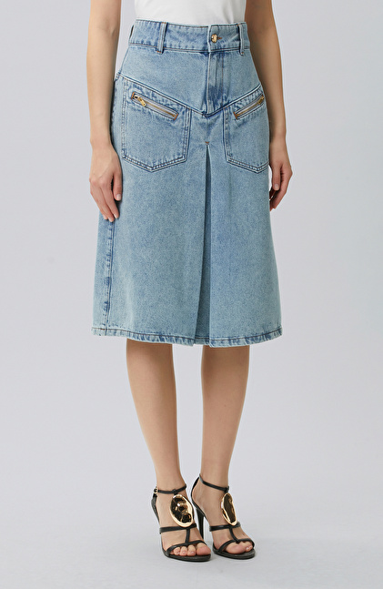 Light Indigo Blue Pleated Detailed Denim Skirt
