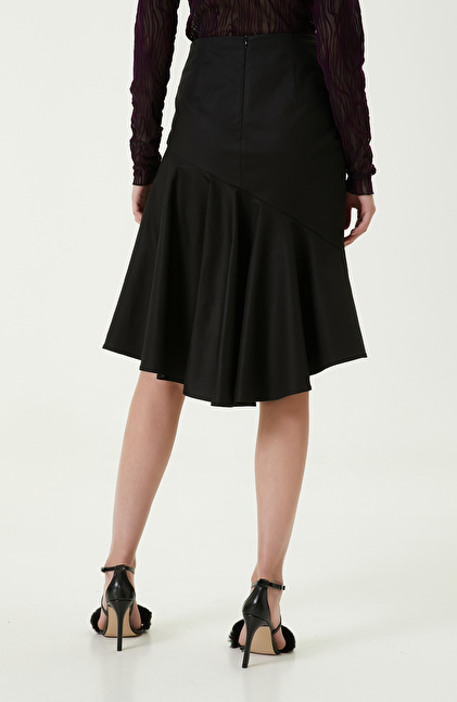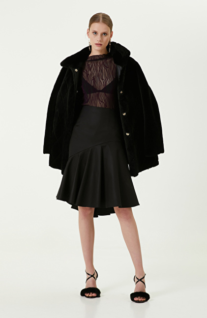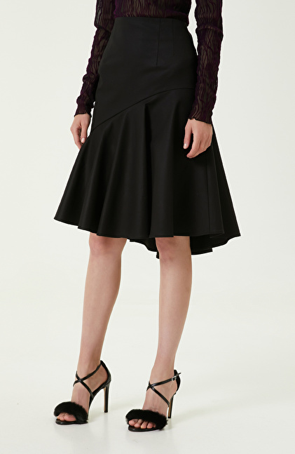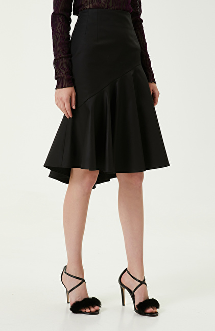NetWork Smart Casual koleksiyonunun çok yönlü parçaları arasında yer alan Etek Ucu Volanlı Siyah Uzun Etek, zamansız ve entelektüel kadınlara hitap eder. Beli saran tasarımı çekici stillere uyum sağlarken volanlı etek ucu eteği daha göz alıcı hale getirir. Sade ve hareketli görünümleri bir arada sunan etek, siyah rengi sayesinde her parça ile kolaylıkla eşleşebilir. Slim fit kalıbı sayesinde dar ve regular giyim modelleriyle kombinlenebilir. Normal bel yüksekliğine sahip eteği, fit bluzlar veya geniş gömleklerle birlikte giyebilirsiniz. Siz de siyah uzun eteği; kırmızı ipek gömlek, siyah rugan stiletto, ekru kürk mont ve gümüş renkli takılarla kombinleyebilir, gösterişli kış görünümleri elde edebilirsiniz.