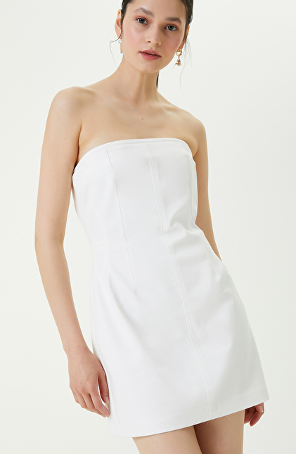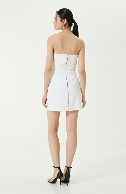 Fermuar Detaylı Ekru Straplez Elbise