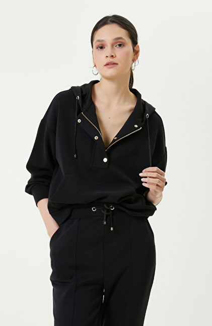NetWork'ün kış stilini yansıtan Fermuar Detaylı Siyah Kapüşonlu Sweatshirt, öz güveni yüksek ve sosyal yaşamda aktif kadınların favori parçaları arasında yer alır. İnovatif tasarım özellikleriyle öne çıkan sweatshirt, basic fit kalıbı ile konforlu hissetmenizi sağlar. Çıtlı ve fermuar kapamalı yaka modeli, farklı stiller oluşturmanıza ve hava sıcaklığına göre ayarlamanıza izin verir. Geniş kapüşon tasarımı ise sabah koşularınızda ekstra koruma sağlar. Sportif stili sayesinde eşofman modelleriyle kombinleyebileceğiniz sweatshirt denim pantolonlarla casual stiline de uyarlanabilir. Siz de siyah sweatshirt'ü; fuşya eşofman altı, beyaz sneaker, siyah deri mont, siyah omuz çantası ve beyaz akrilik takılarla kombinleyerek sportif stiller oluşturabilirsiniz.