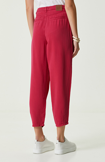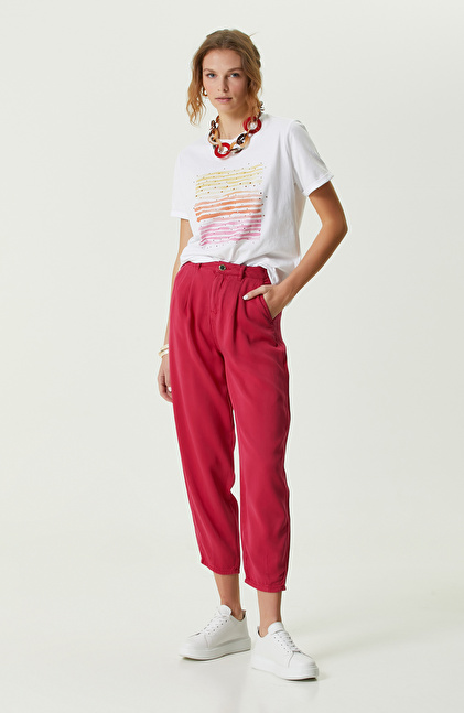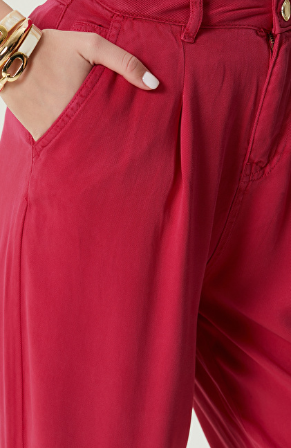 Özgüveni yüksek stil sahibi kadınlara hitap eden Fuşya Pilili Dar Paça Casual Pantolon, NetWork yaz koleksiyonunda yer alan göz alıcı parçalardan biridir. Fuşya rengi ile enerjik yaz kombinlerine imza atmanızı sağlayan pantolon gündelik farklı stillerde kullanılabilir. Dar paça detayı ve normal bel tasarımı ile son derece rahat forma sahiptir, bu sayede crop, standart uzunlukta çeşitli bluzlarla kombinlenebilir. Pili detayı ise daha bol bir form kazandırmakla kalmaz casual stilinizi şık bir şekilde destekler. Siz de fuşya denim pantolonu mint yeşili crop gömlekle giyebilir, açık pembe sandalet, beyaz askılı çanta ve renkli takılarla kombinleyebilirsiniz.