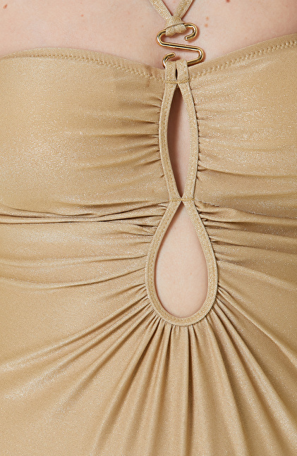 NetWork’ün modern çizgisini taşıyan tasarımlar arasında yer alan Gold (Altın Rengi) Mayo, ilham verici kadınların plaj giyimi için tercihidir. Yaz sezonunda değerlendirilmek üzere üretilen model, NetWork Casual koleksiyonunda bulunur. Slim fit kalıbı ile tasarlandığı için beden üzerinde mükemmel bir duruş sergiler. Üstün kalitede penye kumaş kullanılarak üretilen tasarımın içeriğinde belli oranda metalik lif yer alır. Metalik altın yansıması görünümünün kaynağı içerdiği metalik liflerdir. İddialı bir plaj giyiminin parçası olan mayo, sağladığı yüksek konfor ve ekstra serinlik ile rahat bir şekilde kullanılır. Damla dekolte ayrıntısına sahip modeli kombinlerken; şapka, kimono, sandalet ve büyük hasır çantadan yardım alabilirsiniz.