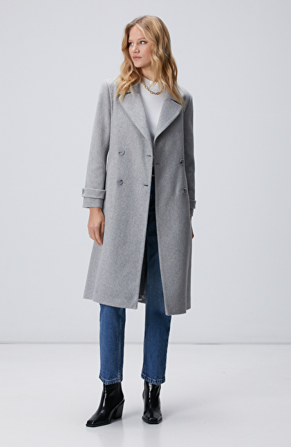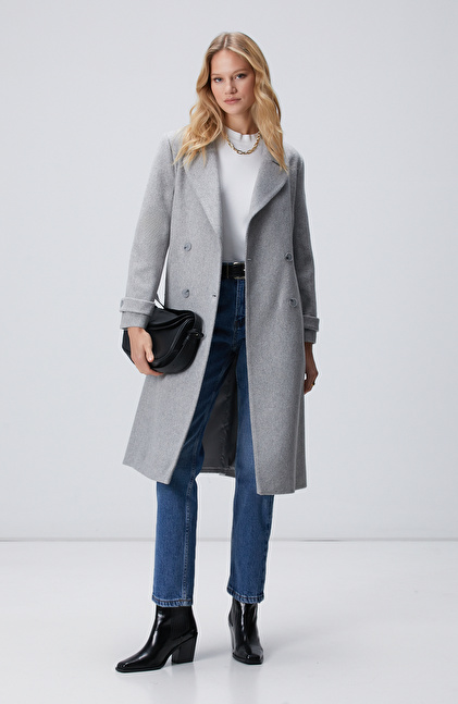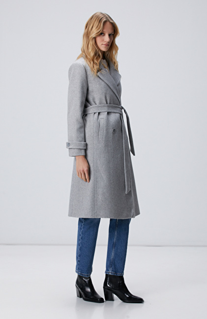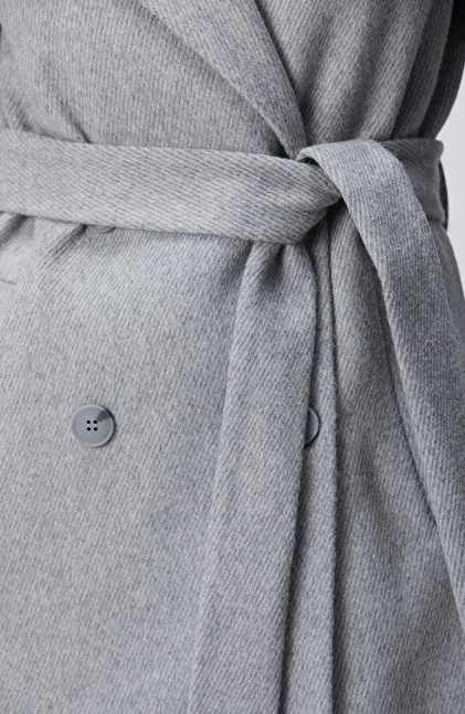 Gri Diyagonal Desen Kuşaklı Uzun Palto