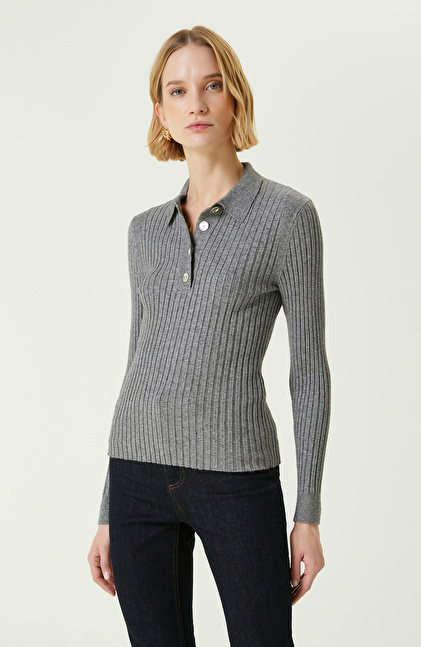 Slim Fit; Polo Yaka; Düğme Kapatmalı; Çizgi Dokulu Kazak